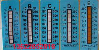 英国"温度美"牌Thermax系列测温纸采用温度测量的新概念在小型贴纸上有一列方格或圆点?代表不同的温度值?当温度上升至该温度点时?方格会转变成黑色?温度降低后也不会回复到原来的颜色这样便可知道物体曾经历过的最高温度?以及是否有超温现象。
