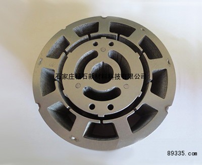 这个转子是由两个零件通过烧结时扩散连接形成的一个组合件,重3.3kg。外部的零件由铁粉制成,密度为70g/cm3;内部的零件由铁一镍一铜材料制成,密度为6.5g/cm3。最终形状是切削加工完成。这个转子用于电动汽车集成的发动助力动力系。混合动力电动汽车有两套驱动装置——无刷DC电动机与1.3L四缸发动机。IMA动力系有一在制动与减速时进行再充电的镍金属混合动力电池组件。