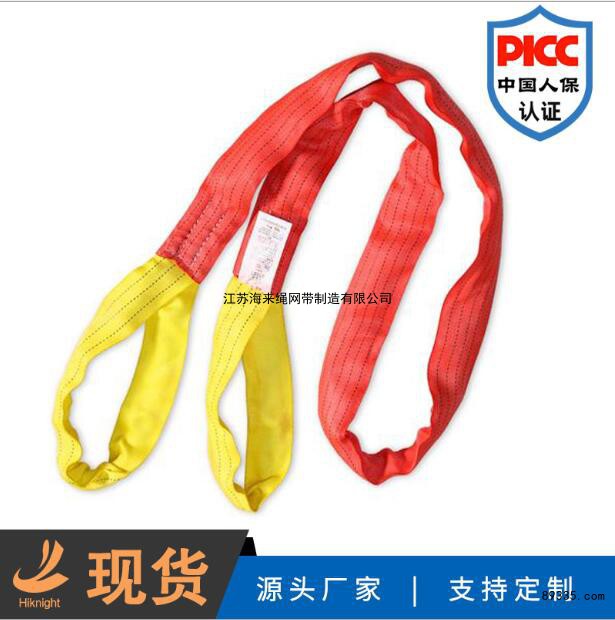 1、柔性封装回环吊带是采用100%PES制成,内部承载芯采用无极环绕以构成循环状100%PES织成不受力的套管对承载芯加以保护。