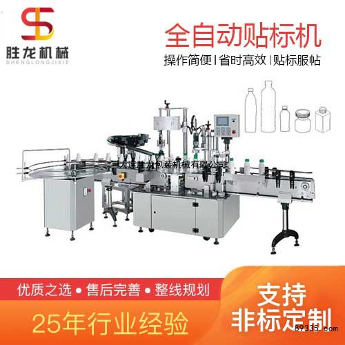 分瓶,使被贴物按需要的间距分离开; 输送物料经过测物电眼时,检测到被贴物; 贴标头步进(伺服)电机转动,标签从剥离板上剥离出标并使标签前端粘贴于被贴物表面,底纸回绕; 测标电眼检测到标签间隙时,标签按设置继续向前伸出预出标长度,送标器步进(伺服)电机停转,出标停止; 被贴物进入卷标装置/抚标装置,标签被平整地卷/压在被贴物上。