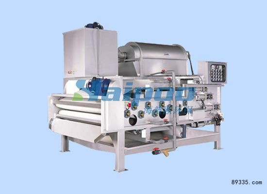带式压滤机 带式压滤机的结构特点 系列带式压滤机的构造紧凑、式样新颖、操作管理方便,处理能力大、滤饼含水率低,效果好。它与同类型设备相比,具有以下特点: 1、*重力脱水段为倾斜式,使污泥距地面高达1700mm,使污泥在重力脱水段高度增加,提高了重力脱水能力。 2、重力脱水段长,*与*二重力脱水段总长5m多,使污泥在压榨前充分脱水失去流动性。同时,重力脱水段还设置反转等特殊机构,经“楔”形、“S”形压榨等作用使污泥滤饼获得较低含水量。 3、*个脱水辊采用“T”型泄水槽,使压榨后的大量水迅速排出,从而提高了脱水效果。 4、滤带跑偏等设有自动控制装置,滤带张力和滤带移动速度可自由调整,操作管理方便。 5、噪音低、无振动。 6、化学药物用量少 应用 该机适用于城市污水处理厂、制药、电镀、造纸、皮革、印染、冶金、化工、屠宰、食品、酿酒、洗煤及环保工程中废水处理工序的污泥脱水,在工业生产中也可用于固液分离之场合,是环境治理和资源回收的理想设备。