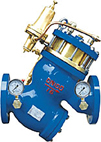 YQ98001过滤活塞式减压阀,是一种利用介质自身能量来调节与控制管路压力的智能型阀门。当阀门从进口端给水时,水流过针阀进入主阀控制室,出口压力通过导管作用到导阀上。当出口压力高于导阀弹簧设定值时,导阀关闭。控制室停止排水,此时主阀控制室内压力升高并关闭主阀,出口压力不再升高。当阀门出口压力降到导阀弹簧设定压力时,导阀开启,控制室向下游排水。由于导阀系统排水量大于针阀的进水量,主阀控制室压力下降。进口压力使主阀开启。在稳定状态下,控制室进水、排水相同,主阀开度不变,出口压力稳定。出口压力不因进口压力变化而改变,亦不因主阀出口流量的变化而改变,安全可靠地将出口压力维持在设定值上。该阀减压精确,性能稳定、安全可靠、安装调节方便,使用寿命长。可用于生活给水、消防系统及工业给水系统。