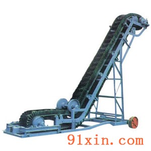 波状挡边大倾角带式输送机(以下简称DJ型输送机)具有在大倾角(30°-90°)范围内物料的输送功能,广泛应用于冶金、化工、煤炭、电力、交通等行业。除具有通用型带式输送机的一般特性外,且具有倾角输送(30°-90°)功能。整机具有结构紧凑、运行可靠、噪声低、输送效率高等特点。根据输送工艺线路的要求,可以和其它输送机械组成多功能的水平、倾斜或垂直的输送系统。