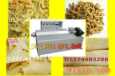 大豆蛋白牛排机,素牛排机,天阳豆制品机械大豆蛋白牛排机是天阳机械公司最新研制的多功能豆制品加工机械。大豆蛋白牛排机采用数显电子控温系统,全封闭设计,加温或降温均有信号灯显示,内外提温,用于膨化各种新式豆制产品。大豆蛋白牛排机所用的专业减速机大大提高了齿轮的耐用性和各种大豆蛋白制品的稳定性。大豆蛋白牛排机是质量好,功能全,更换不同模具可生产多种花样的食品,如:素牛排、素鸡翅、素海螺、素肉条、素鸡脯肉、素肉丁、豆虾、豆肠、豆丝、豆花、豆筋等十多种产品,产品可炒、烹、炖、炸、凉拌,还可用作麻辣小食品原料。目前推广的天阳豆皮机有两种: TYN-A型时产60-80公斤,适配动力2.2KW,价格4260元(畅销),TYN-B型时产80-100公斤,适配动4.5KW,价格5800元,配套设备拌面机1280元,电动切丝机2980元(用户可根据自己的情况选购)。天阳机械张杰欢迎您致电13181307932或13791763698加QQ531079582咨询,网址:www.sdtianyang.com