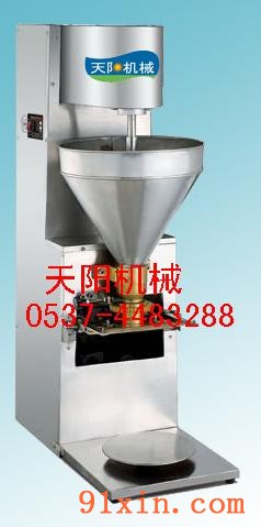 天阳肉丸机,弹性鱼丸机,撒尿牛肉丸子机天阳肉丸机加工的肉丸皮光柔滑、爽脆、让人口齿留香,以其独特的口味及较高的营养价值,深受人们喜爱。用天阳肉丸机加工素肉成本1.5-2元/斤,肉丸3-5元/斤,市场售价3-14元/斤,两人8小时产500斤以上。肉丸机加工的肉丸可以直接批发给零售商,或在肉菜市场、超市展示销售,也可联系各类火锅店、休闲小吃店直接配送,通过多元化经营,加大销量,赚取更大的利润。天阳肉丸机TYW-A型配用动力:750W(220V),产量:30-40公斤/小时,价格 2980元,TYW-B肉丸机配用动力: 1.5KW(220V),产量:60-80公斤/小时,价格:3680元。另供绞肉机,切肉机,打浆机。天阳机械张杰欢迎您致电13791763698或13181307932加QQ531079582咨询,网址:www.sdtianyang.com肉丸是中国传统佳肴,无论是煲汤、涮火锅还是炒、蒸、烧烤、油炸均可,风味独特,让人百吃不厌。天阳肉丸机使用照明电,1-2人可操作,占地少,投资仅三千元,真正做到少投资、见效快。天阳肉丸机成型好,易于操作,采用不锈钢材质,齿轮及易磨损部分均采用优质耐磨材料加工,使用寿命长。自动成型肉丸机与专用切菜打浆机配合,所产肉丸、鱼丸弹韧性好,色泽洁白,口感爽脆、爆浆,清淡低脂,深受用户欢迎。可以生产猪肉丸、牛肉丸、鸡肉丸、鱼肉丸、潮州肉丸、普通肉丸,也可以生产菠菜绿色素丸、胡萝卜素肉丸、香菇肉丸、蛋白素肉丸等素肉蔬菜肉丸系列,肉丸大小可调